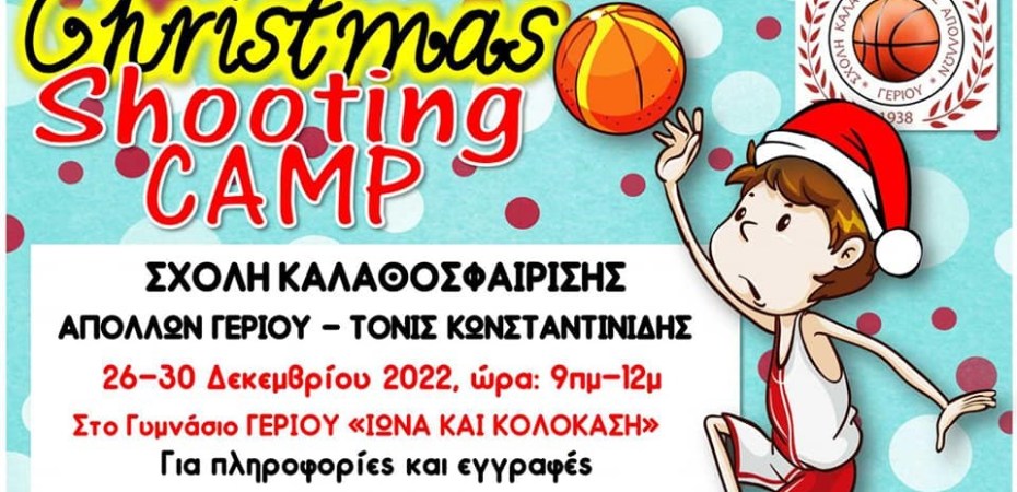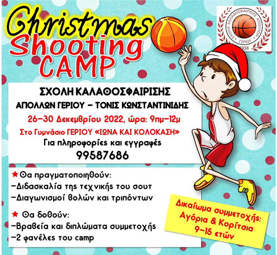 Λιγότερο από μια εβδομάδα μας χωρίζουν από την έναρξη του 2ου CHRISTMAS SHOOTING CAMP 2022, το οποίο θα διοργανώσει η ΑΚΑΔΗΜΙΑ ΚΑΛΑΘΟΣΦΑΙΡΙΣΗΣ ΑΠΟΛΛΩΝ ΓΕΡΙΟΥ-ΤΟΝΙ ΚΩΝΣΤΑΝΤΙΝΊΔΗΣ, από τις 26-30 Δεκεμβρίου, από τις 9-12 π.μ. στις αθλητικές εγκαταστάσεις του Γυμνασίου Γερίου «Ιωνά και Κολοκάση».